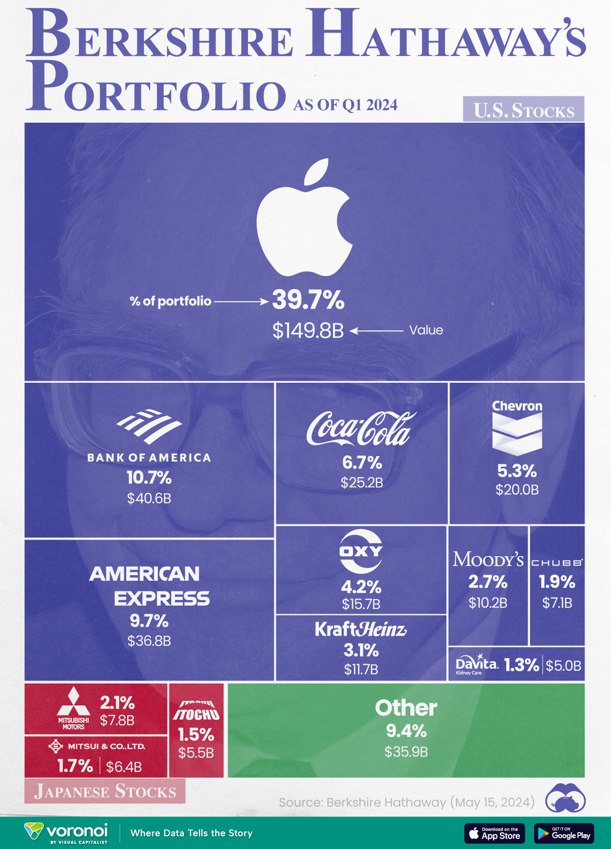 🔺 波克夏・海瑟威 旗下所投資的前幾大佔比企業。 (未來可能會有部分變化),資料來源:https://www.visualcapitalist.com/visualizing-berkshire-hathaways-stock-portfolio-q1-2024/
