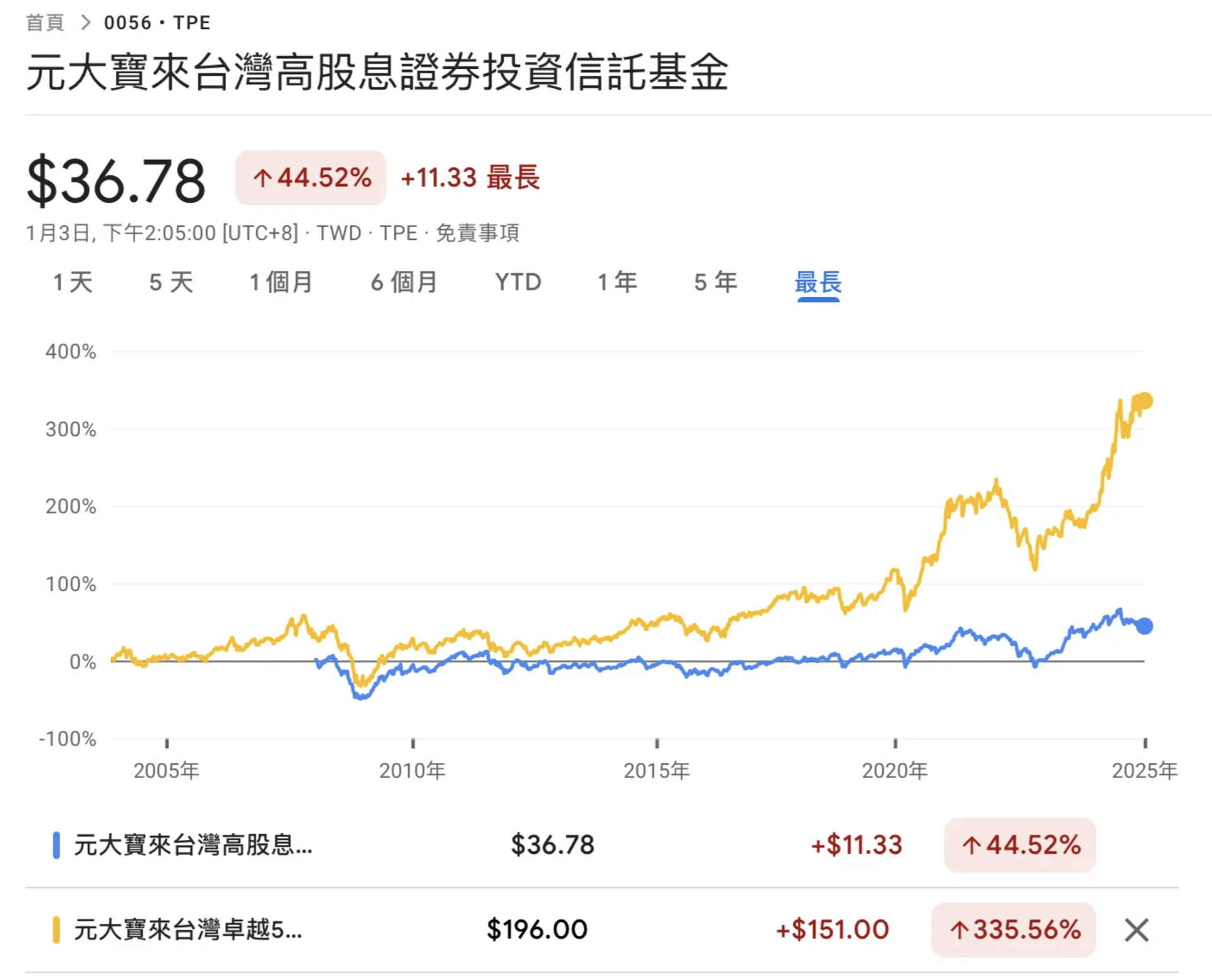 由元大投信所發行的這兩檔ETF「0056和0050」,很多人會把它們拿來一起比較,所以這邊我也幫你簡單做個比較給你參考。