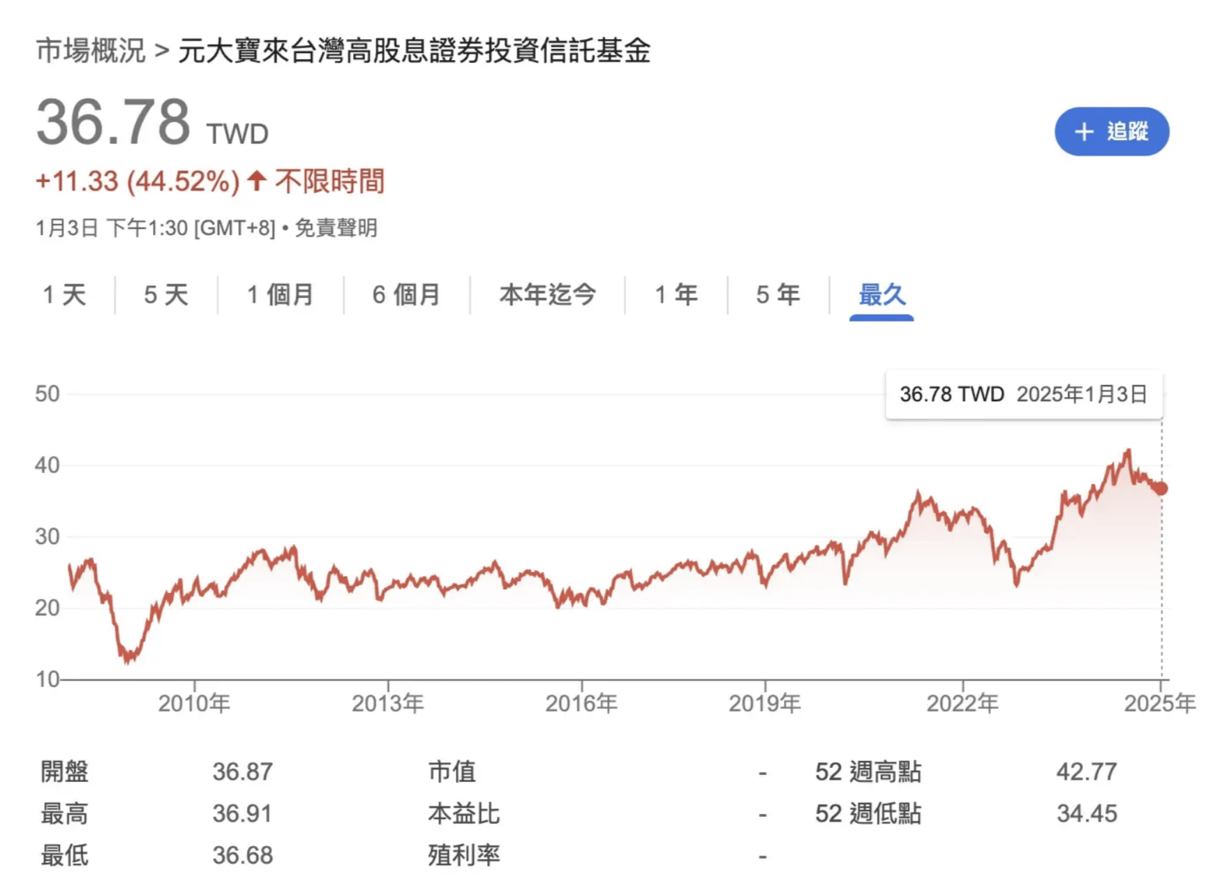 🔺0056台灣高股息ETF從上市到現在的股價走勢圖。圖片來源:Google Finance