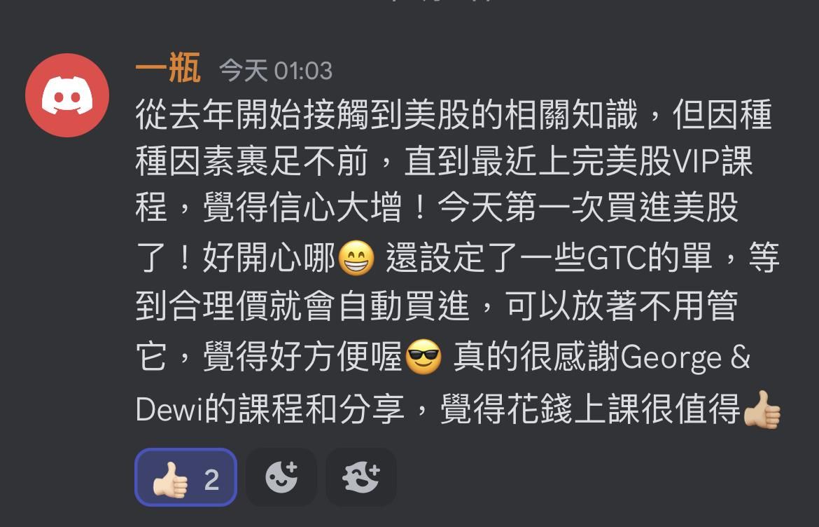 剛開始投資股票難免會覺得有點緊張,生怕按錯什麼錢就不見了,而慢遊美股VIP是採George & Dewi 雙導師制度,並且提供你學員專屬的討論社群,你完全不用擔心遇到問題找不到人詢問,當你卡關時我們都會親自回覆你。