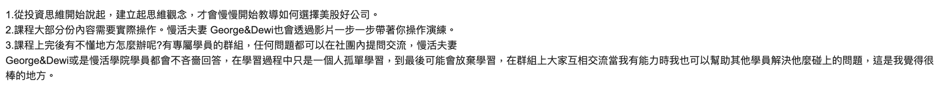 | 課外協助 | 課程採雙講師制,除了影片教學外,還有提供社群讓你能問問題與討論 | 有些課程只有影片,實際投資遇到問題時沒有人可以即時詢問 |