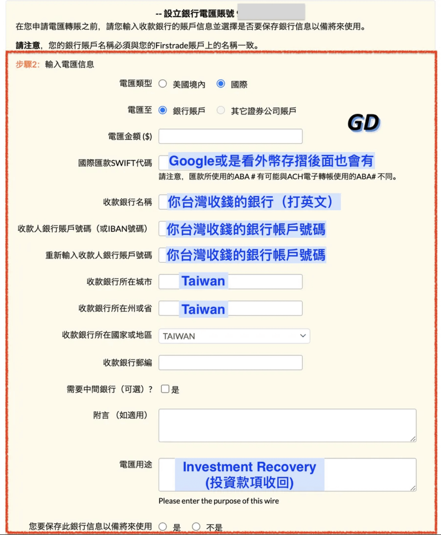照著填寫以下表格,檢查送出後等待一兩天左右,Firstrade 會打通電話跟你確認是本人要轉移資金回台灣,確認完成之後他們才會將款項轉給你