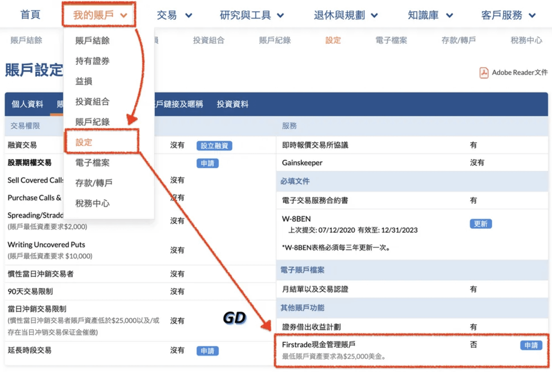 登入後從「我的帳戶」選「設定」,最後到右下角你會看到 Firstrade 現金管理帳戶的地方,按下申請