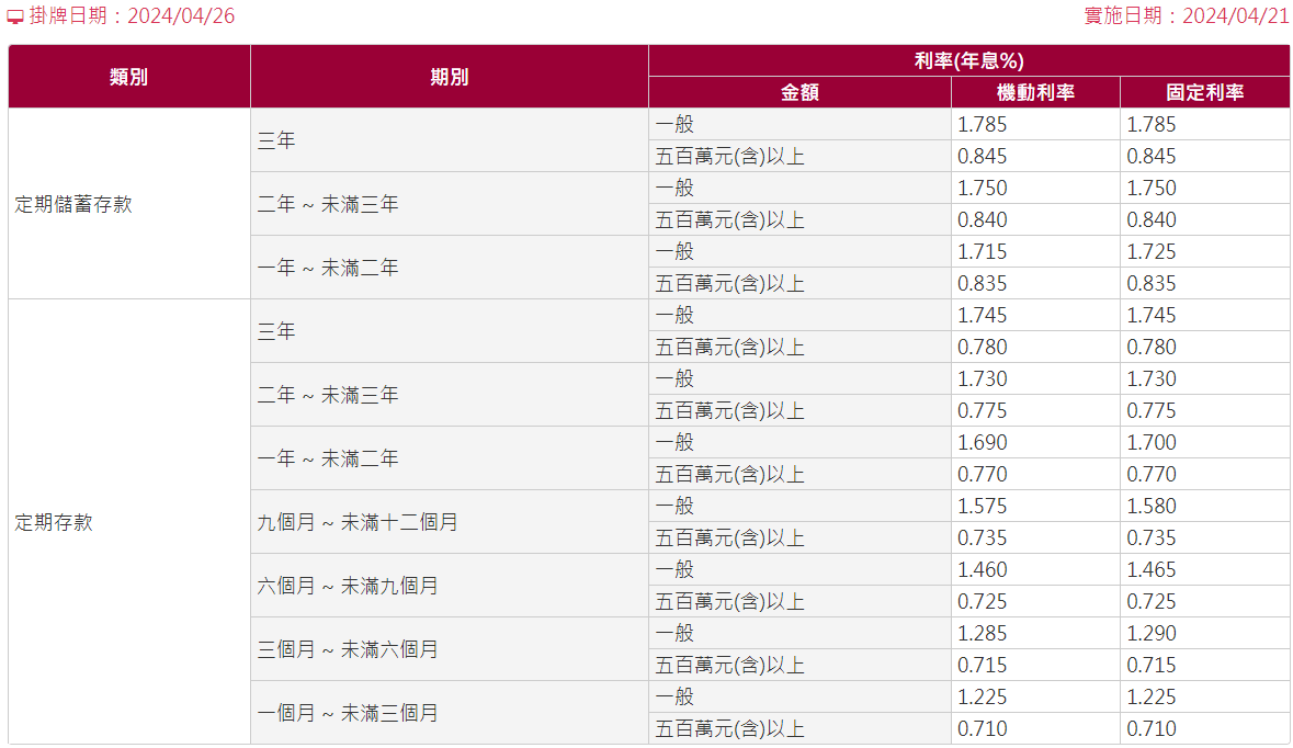 - 固定利率:在存款期間,計算利息的利率從頭到尾都維持不變。