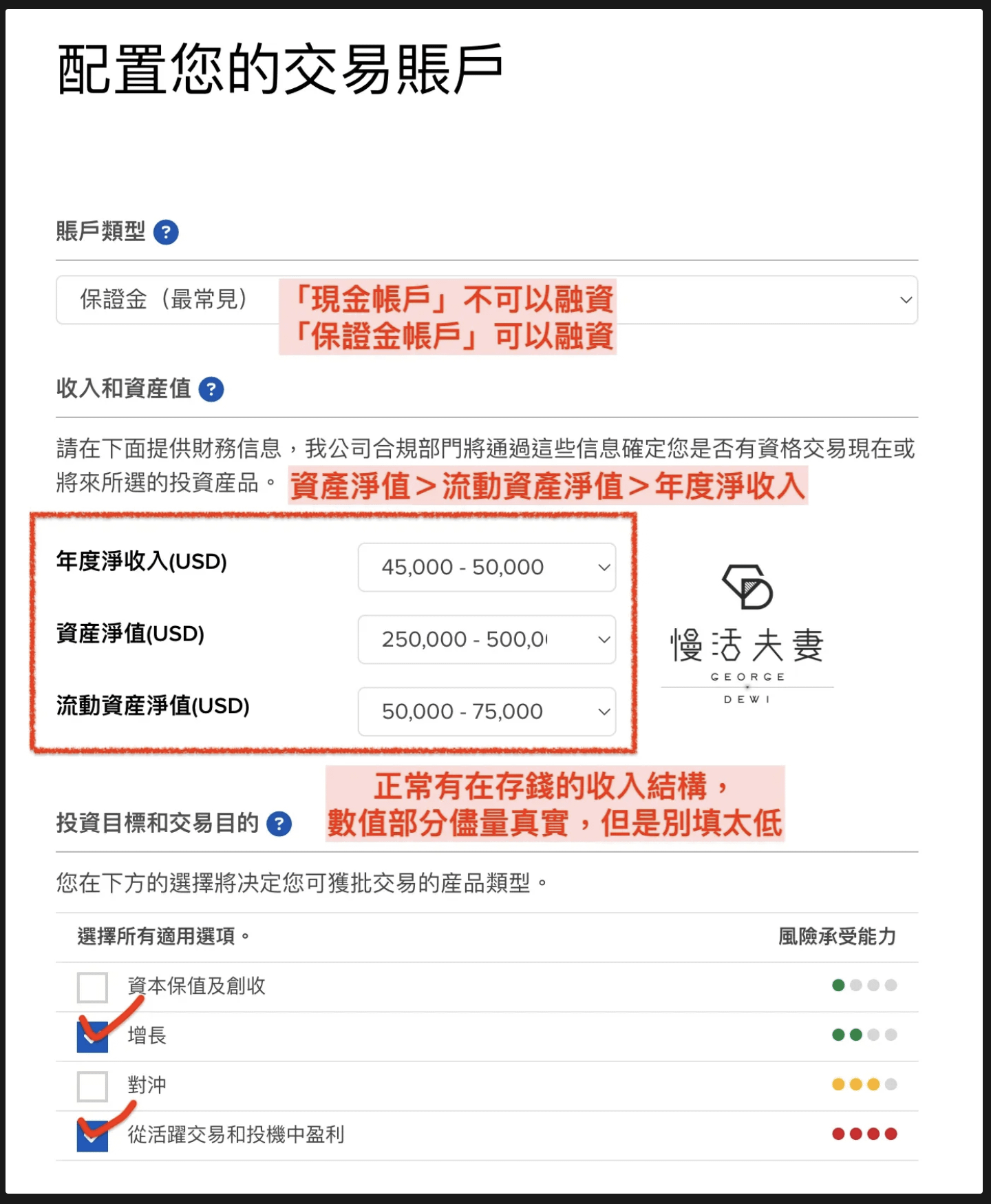 帳戶類型看你的需求去做選擇,再來收入和資產值這裡就照實填寫,但也不要寫太低,以免申請被拒絕。
