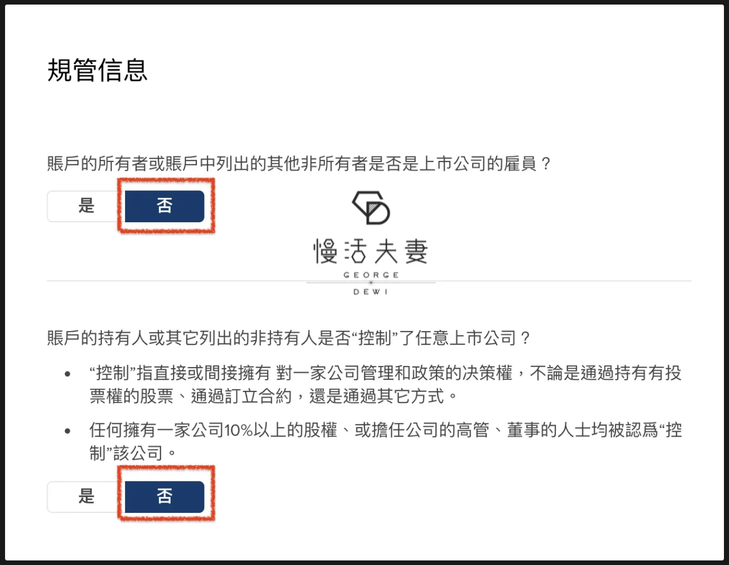 以下兩個規管信息,照我們圖示的填寫「否」就可以囉,因為大部分人都不具有上市公司股權10%以上股份。