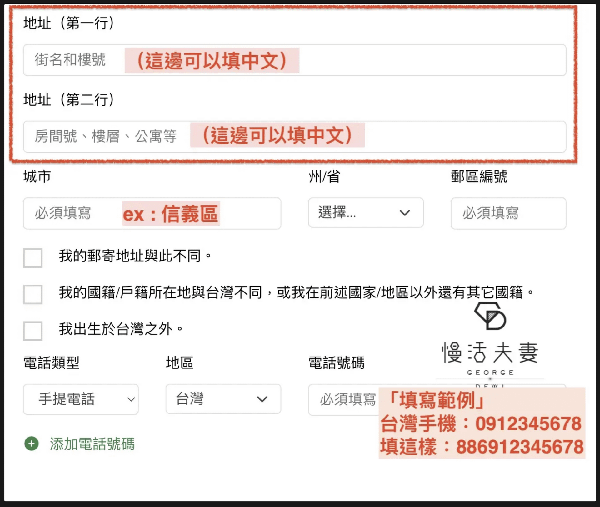 另外手機號碼部分,記得我嗯是台灣所以前面是+886開頭,然後不用填寫0,如果還是不知道怎麼填的話,可以看下面圖片中的示範喔。(香港人則用香港的區碼)