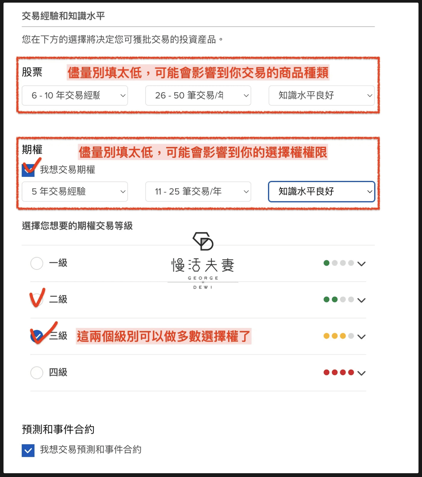 在經驗這塊如果寫得太低,非常有可能只能買賣現股,其他只有有一點點風險的都不可以買賣,更不可以融資。