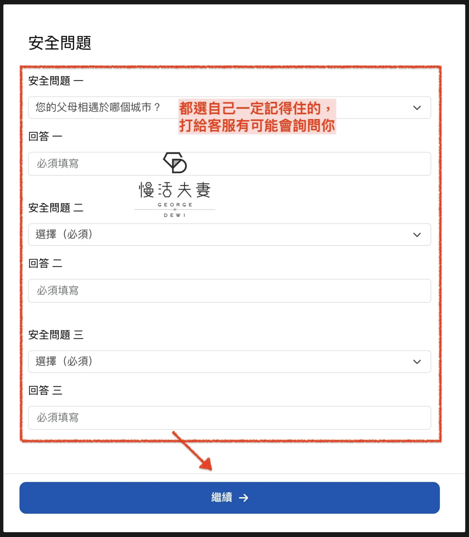 這邊為了保護你的帳號,這裡可以設定幾個安全問題,不要選太複雜的問題以免自己到時候忘記XD