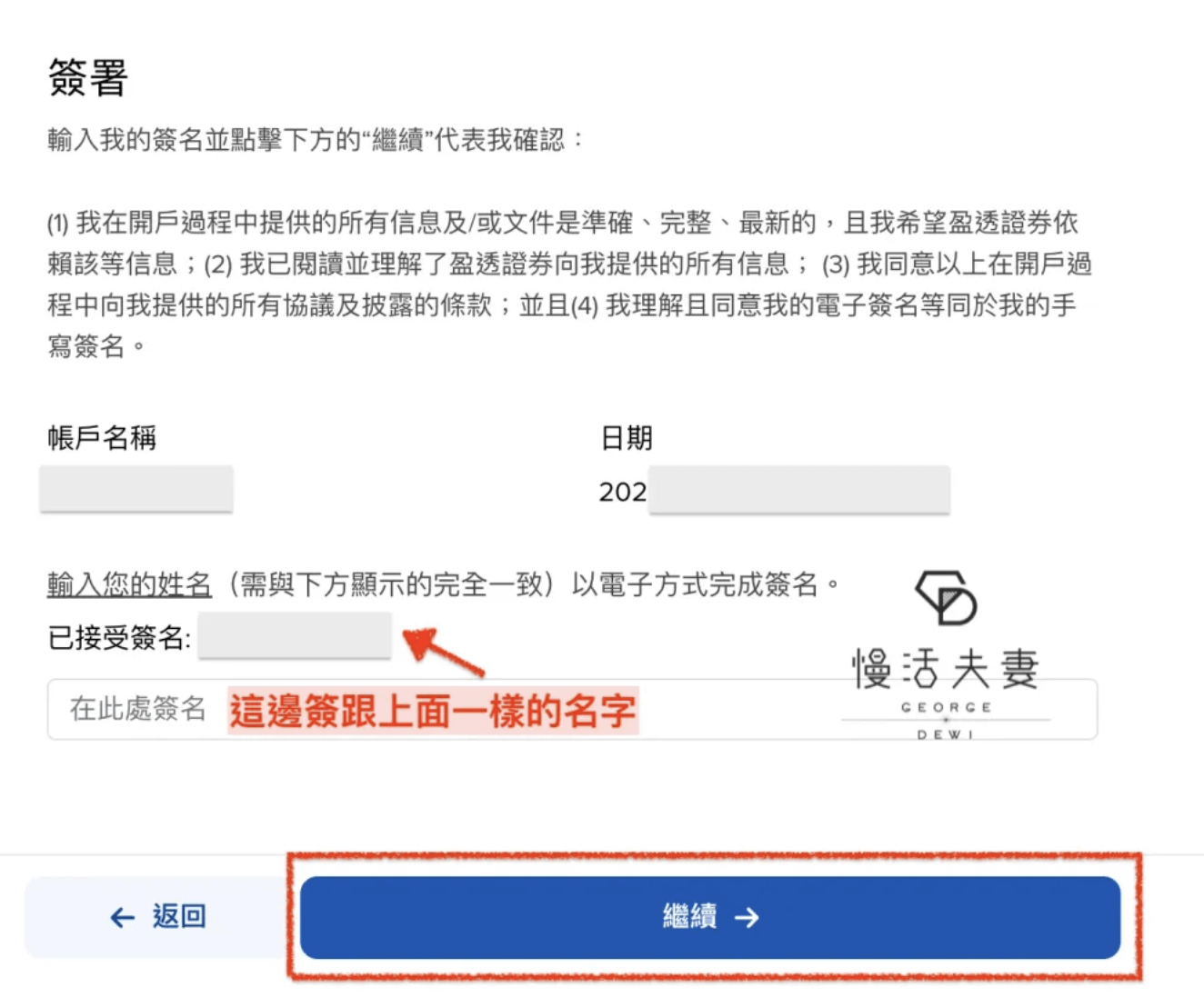 進行電子簽名(用打字的)、然後點左下角或右上角的「繼續申請」。
