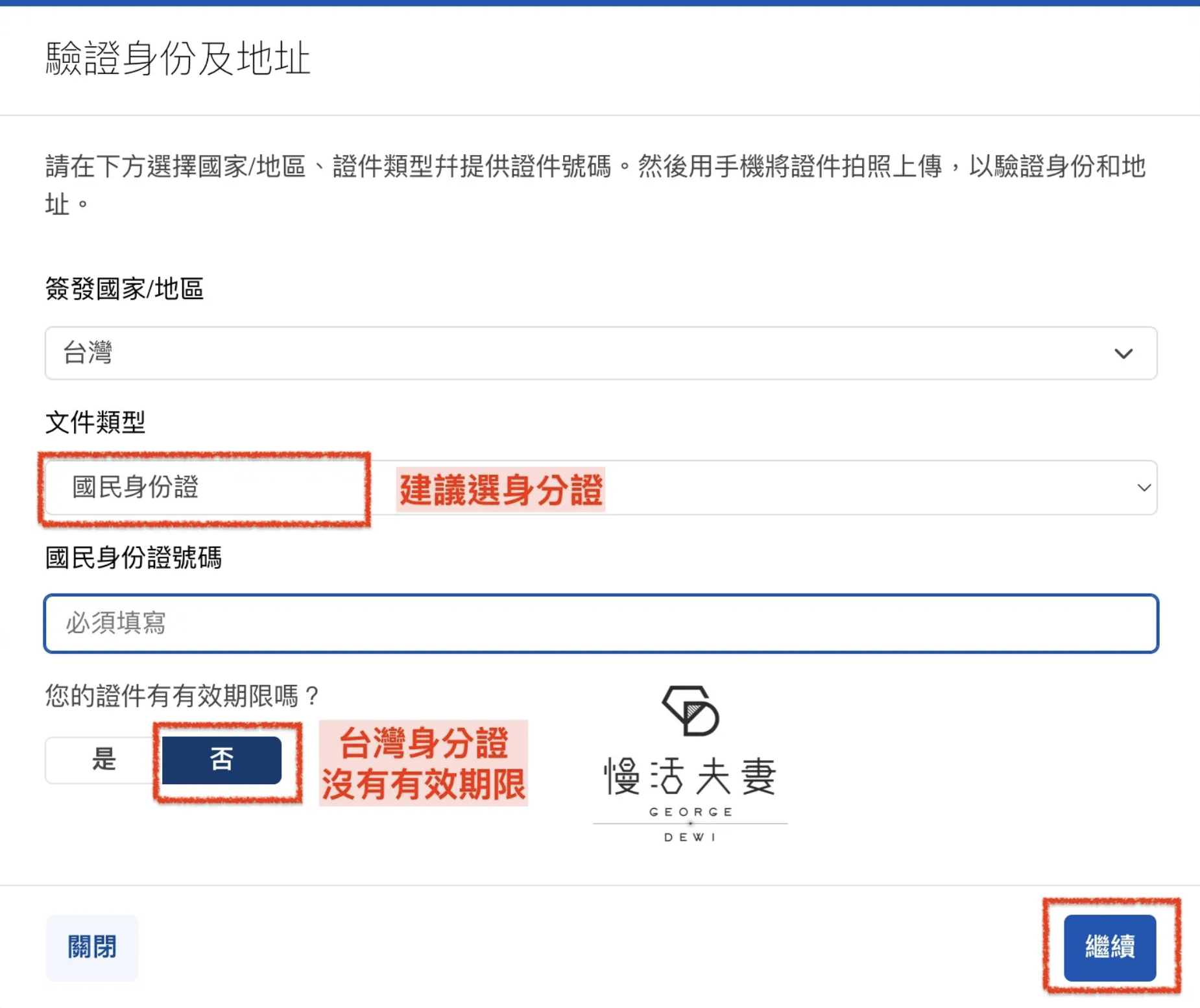 選擇身分證、填寫身分證字號、有效期限選「否」。(台灣和香港的身分證沒有有效期限)