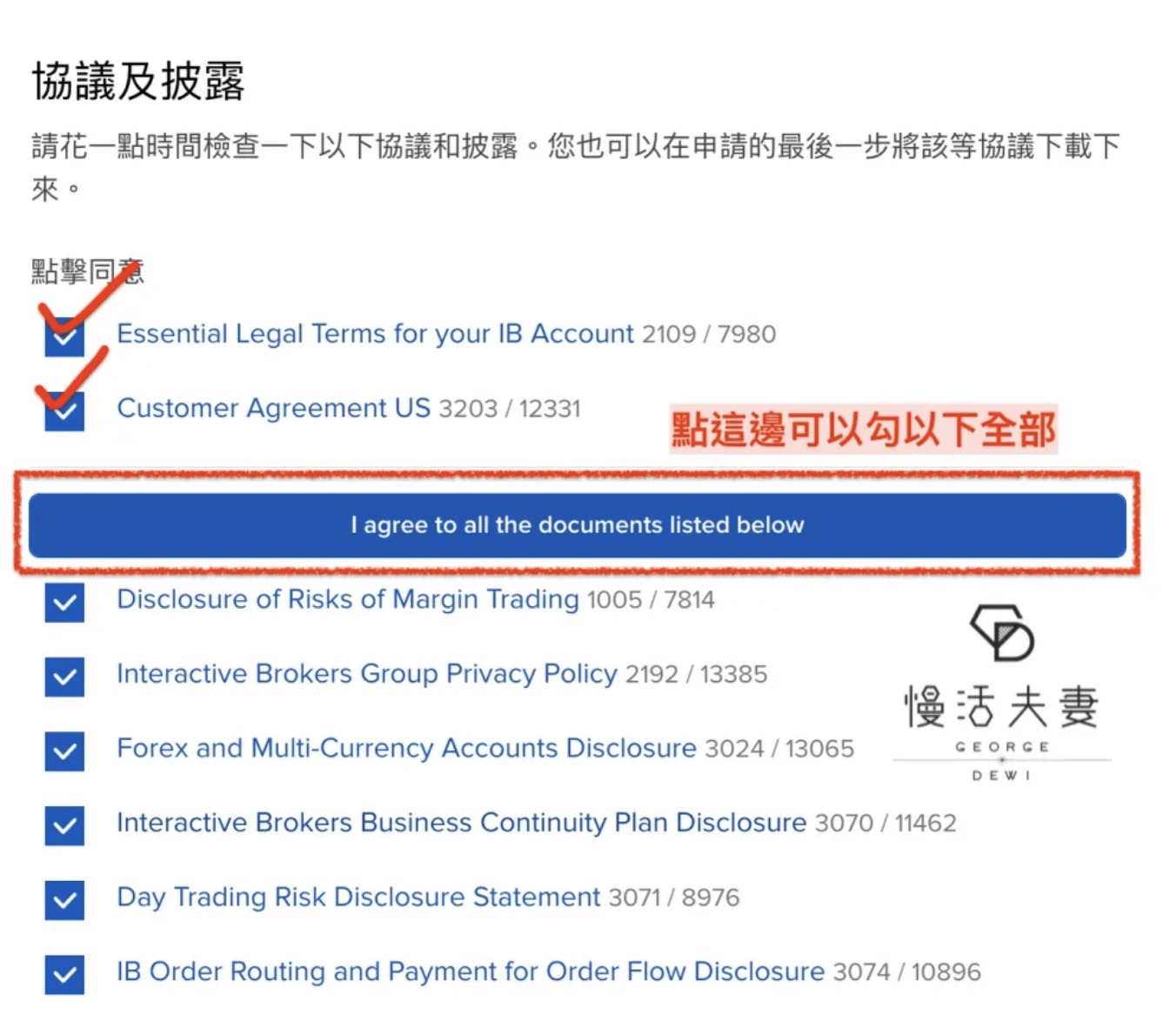 再次確認資料正確性、協議及披露底下全部打勾。可以直接點選「I agree to all documents listed below」