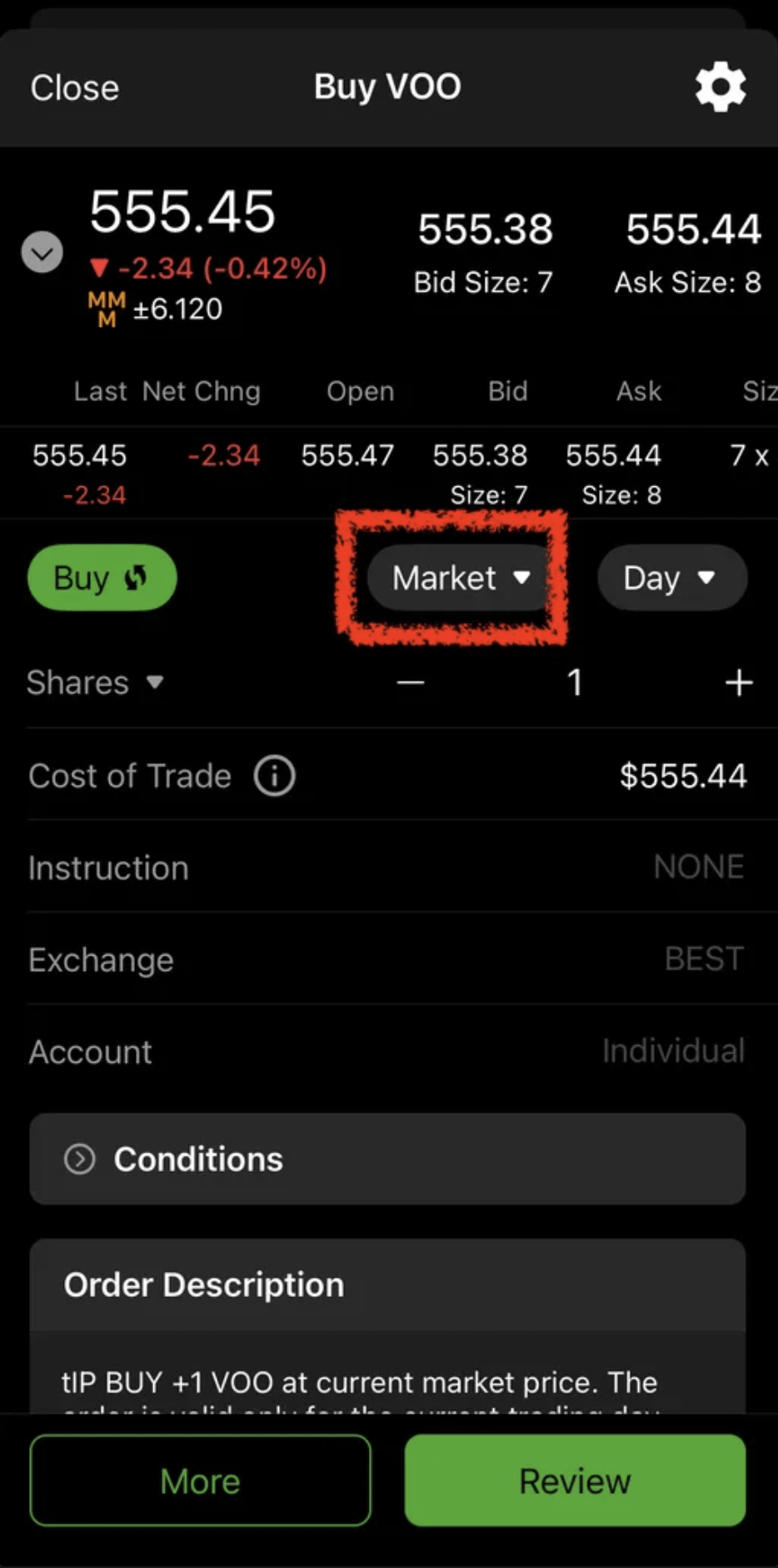 🔺以嘉信的下單軟體 Thinkorswim 為例,可以看到紅框部分的「Market」就是代表你這張訂單要使用市價單、不指定價格的意思