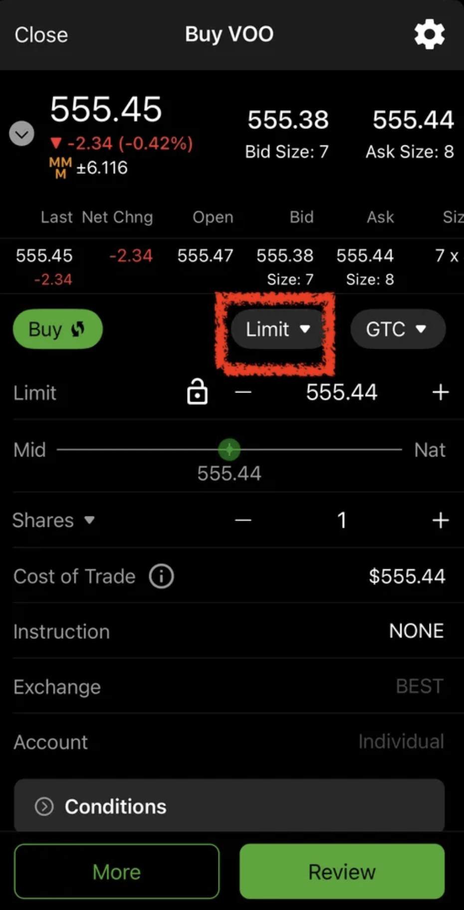 🔺以嘉信的下單軟體 Thinkorswim 為例,可以看到紅框部分的「Limit」就是代表你這張訂單要使用限價單、指定價格的意思