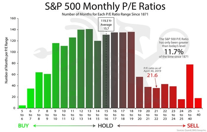 簡單一點來說,當大盤本益比<15時,你會很容易在整個市場中找到便宜的股票。但是如果今天大盤本益比>16,甚至2019年本益比到21.6左右時,你會發現整個市場中的股票都是偏貴的。