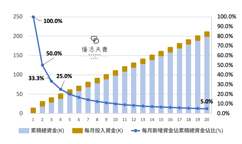 從下圖可以發現隨著時間推移,你每個月定額新增的資金在你總投資資產裡的佔比會越來越低,也就是說假設你後期真的有某個月買在超級便宜的價格,但是因為這筆新資金在整體資產中佔比太低,根本對於整體的購買成本影響不大。