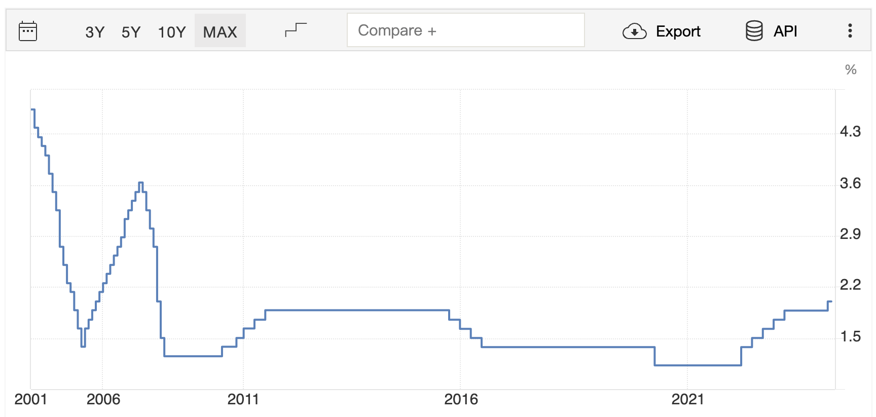 🔺 台灣央行利率多數時間都不會超過2.5%,因為這和國家政策和出口導向有關係。