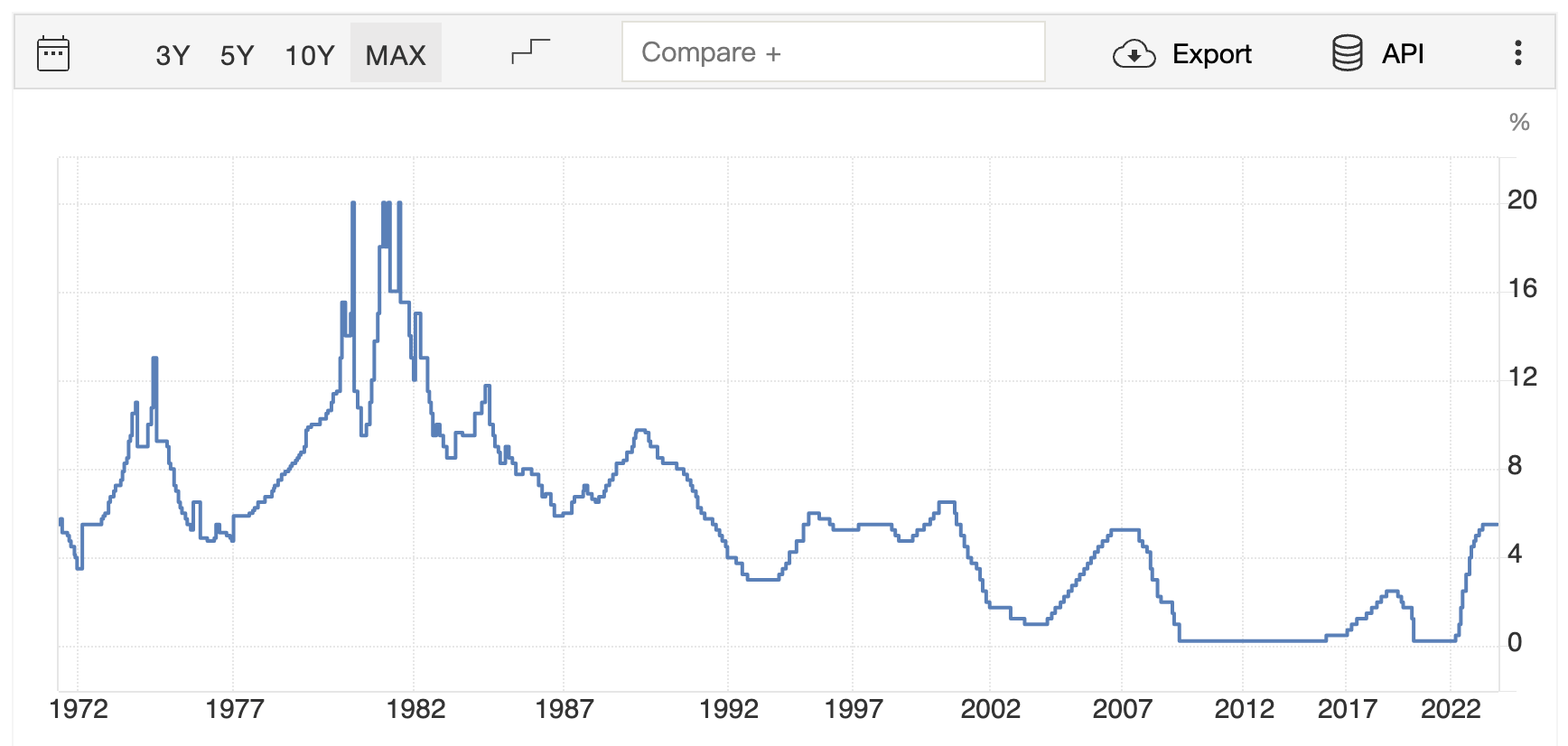 🔺 美國聯準會(FED)會視經濟狀況調節短期利率。資料來源:https://tradingeconomics.com/united-states/interest-rate