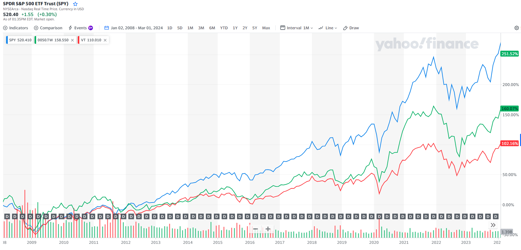 🔺 SPY、VT、0050長期的投資報酬率。 資料來源:yahoo finance